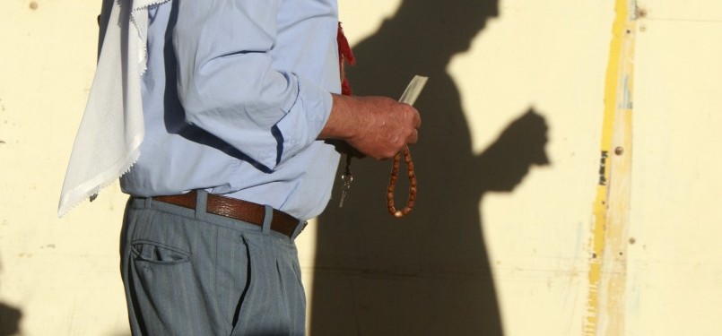 Seorang kakek menunggu sembari membaca tasbih saat hendak melewati pos penjagaan. Ia hendak shalat di Masjid Al Aqsha.